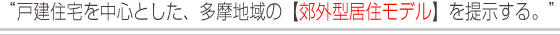 これから多摩地域の暮らしや住宅はどうあるべきか示す、快適・安心・安全な郊外型居住のモデルをつくりあげ、リアルな形で提示していきます。 |