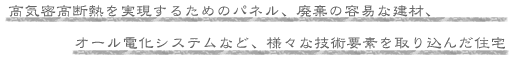 ○木造在来軸組み工法 ○高気密・高断熱(Q=1.9w/m2k,C=1cm2/m2以下) ○坪単価50万円以下 ○オール電化 ○エコ素材(高機能、サスティナブル) ○フレキシブルな内部空間 ○石膏ボードを一切使わない住宅 ○建材規格の単純化(躯体軸組、開口部等) ○外観の多様性